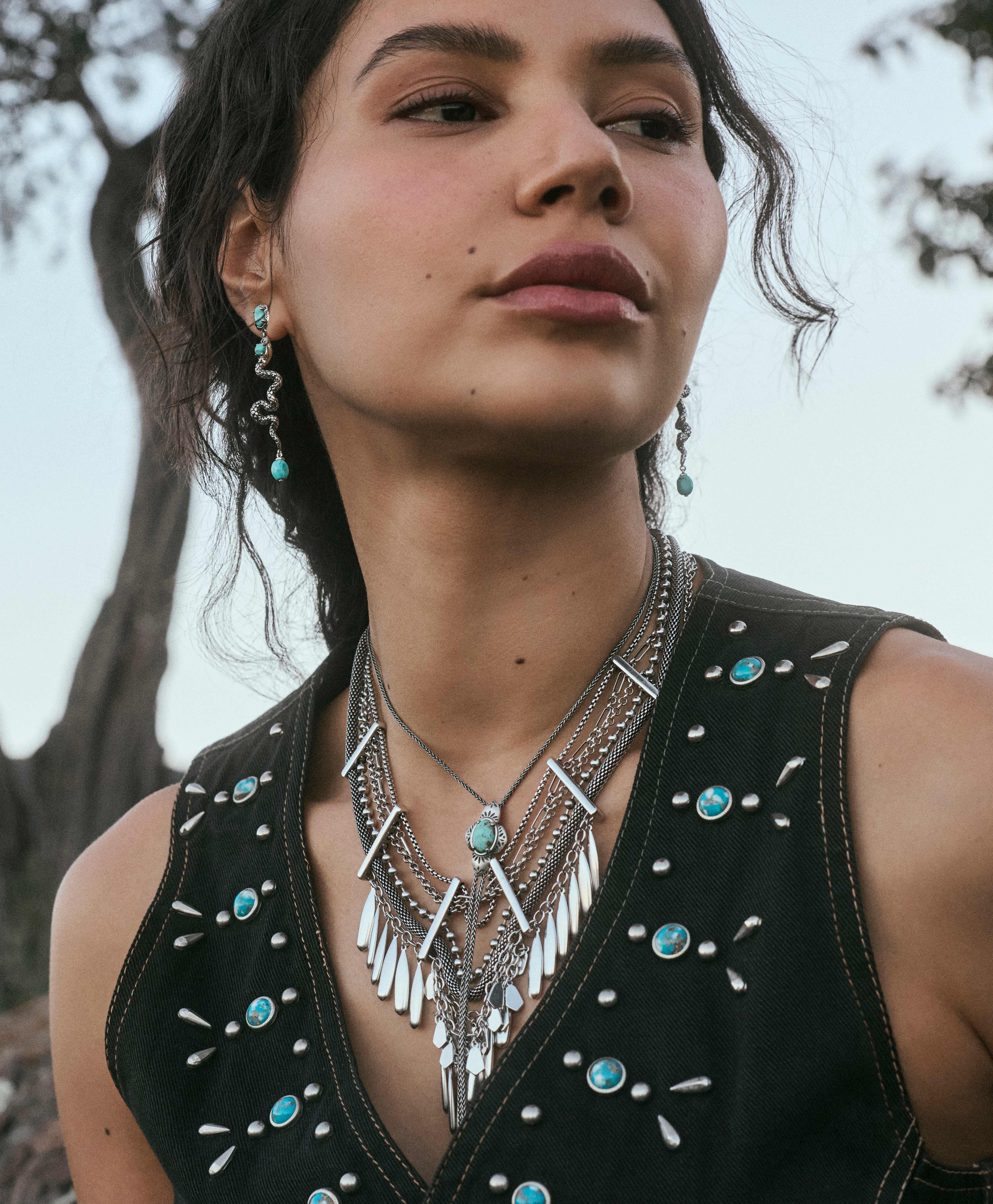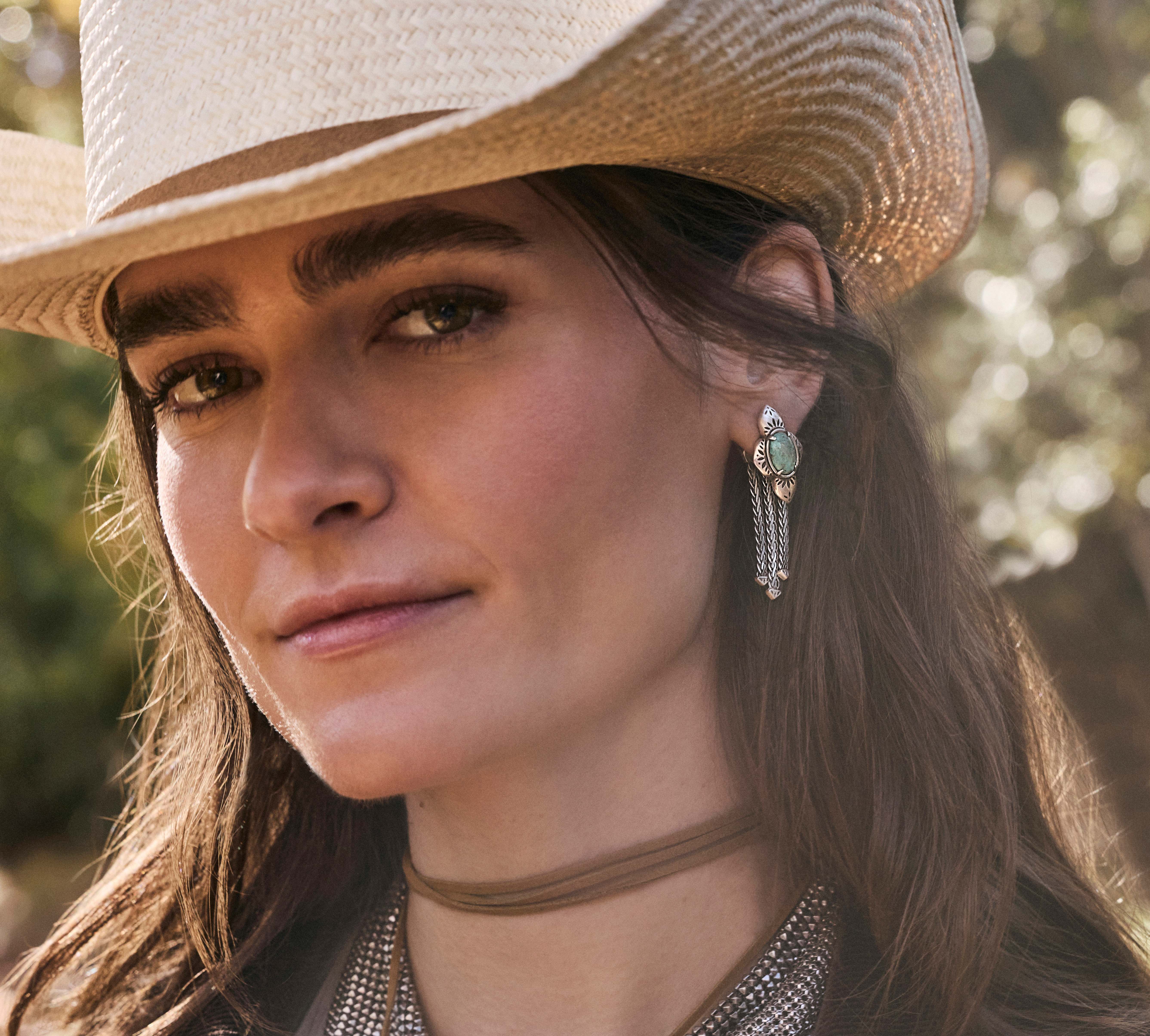 Create the cowgirl look of your dreams with our bestselling necklace styles. The Sydney Statement Necklace and Abbie Bolo Necklace come together in bold, vintage-inspired metals for a striking, layered look. A celebration of our Texas roots, these pieces are designed to stack, shine, and make a statement. Shop the look and add some Western-inspired edge to your everyday style.